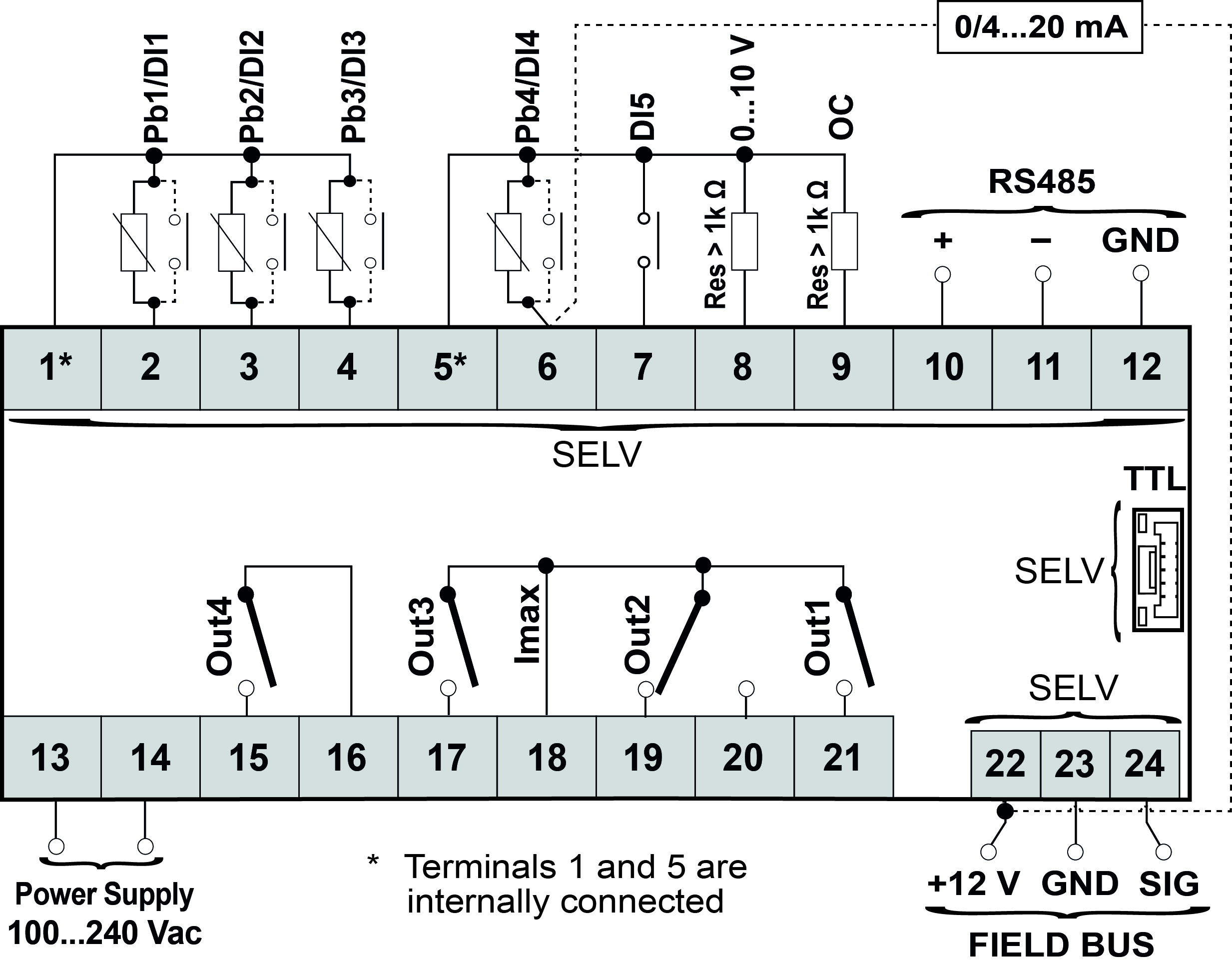 3x NTC/PTC/Pt1000 or Digital input, 1x NTC/PTC/Pt1000 or Digital Input o 0…20 mA/4…20 mA