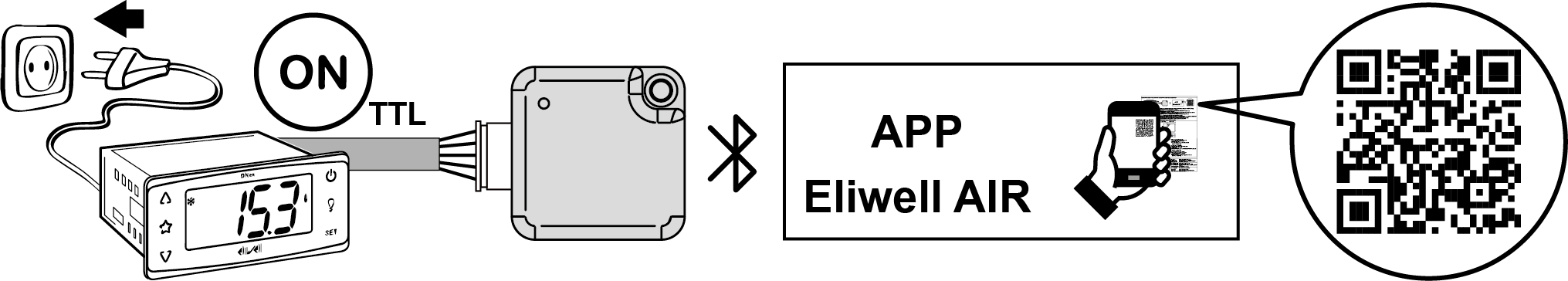 La soluzione Eliwell AIR, con il modulo AIR BT, permette la configurazione dei dispositivi Eliwell tramite l’app mobile Eliwell AIR (iOS/Android).